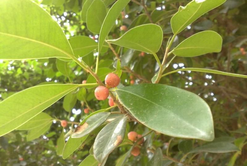 榕树是大乔木,高达15-25米,胸径达50厘米,冠幅广展;老树常有锈褐色气根。树皮深灰色。叶薄革质,狭椭圆形,长4-8厘米,宽3-4厘米,先端钝尖,基部楔形,表面深绿色,干后深褐色,有光泽,全缘,基生叶脉延长,侧脉3-10对;叶柄长5-10毫米,无毛;托叶小,披针形,长约8毫米。