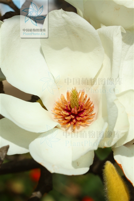 【特征】落叶乔木,高达25米,胸径1米,枝广展形成宽阔的树冠;树皮深灰色,粗糙开裂;小枝稍粗壮,灰褐色;冬芽及花梗密被淡灰黄色长绢毛。叶纸质,倒卵形、宽倒卵形或、倒卵状椭圆形,基部徒长枝叶椭圆形,长10-15(18)厘米,宽6-10 (12)厘米,先端宽圆、平截或稍凹,具短突尖,中部以下渐狭成楔形,叶上深绿色,嫩时被柔毛,后仅中脉及侧脉留有柔毛,下面淡绿色,沿脉上被柔毛,侧脉每边8-10条,网脉明显;叶柄长1-2.5厘米,被柔毛,上面具狭纵沟;托叶痕为叶柄长的1/4-1/3。花蕾卵圆形,花先叶开放,直立,芳香,直径10-16厘米;花梗显著膨大,密被淡黄色长绢毛;花被片9片,白色,基部常带粉红色,近相似,长圆状倒卵形,长6-8(10)厘米,宽2.5-4.5(6.5)厘米;雄蕊长7-12毫米,花药长6-7毫米,侧向开裂;药隔宽约5毫米,顶端伸出成短尖头;雌蕊群淡绿色,无毛,圆柱形,长2-2.5厘米;雌蕊狭卵形,长3-4毫米,具长4毫米的锥尖花柱。聚合果圆柱形(在庭园栽培种常因部分心皮不育而弯曲),长12-15厘米,直径3.5-5厘米;蓇葖厚木质,褐色,具白色皮孔;种子心形,侧扁,高约9毫米,宽约10毫米,外种皮红色,内种皮黑色。花期2-3月(亦常于7-9月再开一次花),果期8-9月。