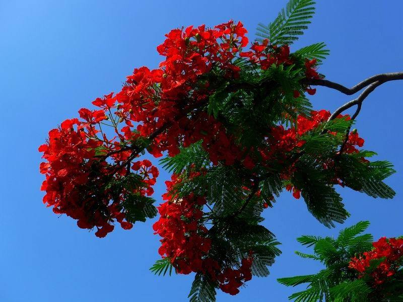 【特征】凤凰木为高大落叶乔木,取名于“叶如飞凰之羽,花若丹凤之冠”,无刺, 高达20余米,胸径可达1米;树皮粗糙,灰褐色;树冠扁圆形,分枝多而开展;小枝常被短柔毛并有明显的皮孔。浅根性,但根系发达,抗风能力强。抗空气污染。萌发力强,生长迅速。凤凰木叶为二回偶数羽状复叶,长20-60厘米,具托叶;下部的托叶明显地羽状分裂,上部的成刚毛状;叶柄长7-12厘米,光滑至被短柔毛,上面具槽,基部膨大呈垫状;羽片对生,15-20对,长达5-10厘米;小叶25对,密集对生,长圆形,长4-8毫米,宽3-4毫米,两面被绢毛,先端钝,基部偏斜,边全缘;中脉明显;小叶柄短。伞房状总状花序顶生或腋生;花大而美丽,直径7-10厘米,鲜红至橙红色,具4-10厘米长的花梗;花托盘状或短陀螺状;萼片5,里面红色,边缘绿黄色;花瓣5,匙形,红色,具黄及白色花斑,长5-7厘米,宽3.7-4厘米,开花后向花萼反卷,瓣柄细长,长约2厘米;雄蕊10枚;红色,长短不等,长3-6厘米,向上弯,花丝粗,下半部被绵毛,花药红色,长约5毫米;子房长约1.3厘米,黄色,被柔毛,无柄或具短柄,花柱长3-4厘米,柱头小,截形。荚果带形,扁平,长30-60厘米,宽3.5-5厘米,稍弯曲,暗红褐色,成熟时黑褐色,顶端有宿存花柱;种子20-40颗,横长圆形,平滑,坚硬,黄色染有褐斑,长约15毫米,宽约7毫米。花期6-7月,果期8-10月。