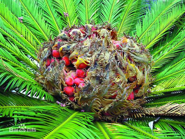 【形态特征】常绿乔木,树干高约2米,稀达8米或更高,圆柱形如有明显螺旋状排列的菱形叶柄残痕。羽状叶从茎的顶部生出 ,下层的向下弯,上层的斜上伸展,整个羽状叶的轮廓呈倒卵状狭披针形,长75-200厘米,叶轴横切面四方状圆形,柄略成四角形,两侧有齿状刺,水平或略斜上伸展,刺长2-3毫米;羽状裂片达100对以上,条形,厚革质,坚硬,长9-18厘米,宽4-6毫米,向上斜展微成“V"字形,边缘显著地向下反卷,上部微渐窄,先端有刺状尖头,基部窄,两侧不对称,下侧下延生长,上面深绿色有光泽,中央微凹,凹槽内有稍隆起的中脉,下面浅绿色,中脉显著隆起,两侧有疏柔毛或无毛。