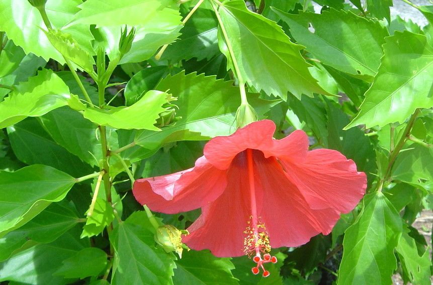 【特征】朱槿是常绿灌木,株高约1-3米;小枝圆柱形,疏被星状柔毛。叶阔卵形或狭卵形,长4-9厘米,宽2 5厘米,先端渐尖,基部圆形或楔形,边缘具粗齿或缺刻,两面除背面沿脉上有少许疏毛外均无毛;叶柄长5-20毫米,上面被长柔毛;托叶线形,长5-12毫米,被毛。