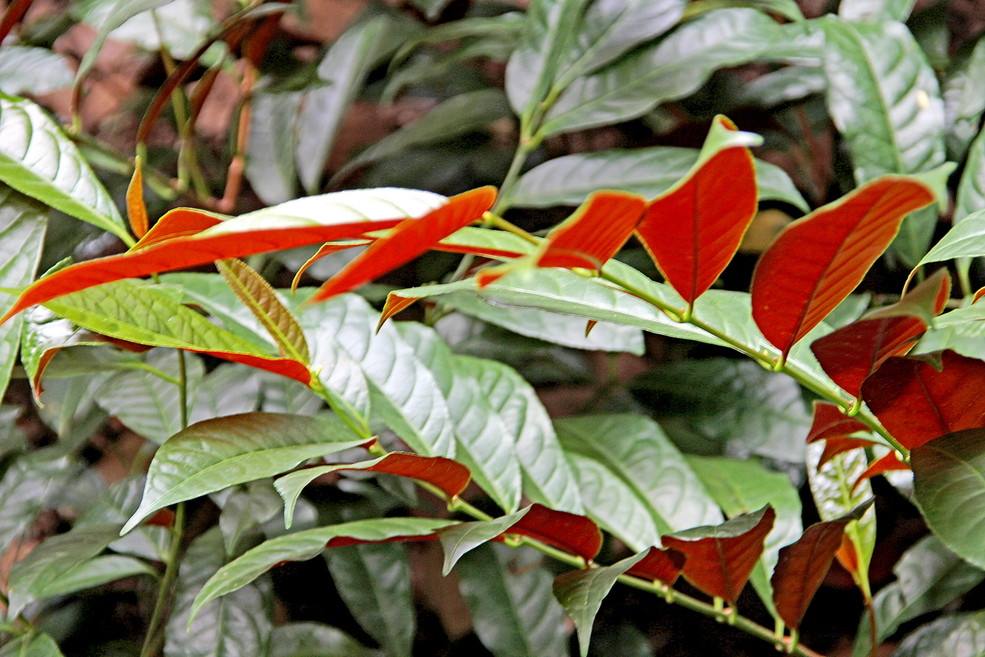 【特征】常绿灌木,高达1米许;枝无毛,具多数皮孔。叶对生,稀兼有互生或近3片轮生,纸质,叶片狭椭圆形或长圆形,长6-14厘米,宽1.2-4厘米,顶端长渐尖,基部渐狭,边缘有疏细齿,齿间距3-10毫米,两面均无毛,腹面绿色,背面紫红或血红色;中脉于两面均凸起,侧脉8-12对,弧曲上升,离缘弯拱连接,网脉不明显;叶柄长3-10毫米,无腺体;托叶卵形,顶端尖,长约1毫米。
