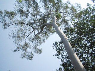 【形态特征】大乔木,高28米,树干挺直;树皮光滑,灰白色或红灰色, 大片状脱落。幼态叶片披针形,有腺毛,基部圆形,叶柄盾状着生;成熟叶片狭披针形,宽约1厘米,长10-15厘米,稍弯曲,两面有黑腺点,揉之有浓厚的柠檬气味;过渡性叶阔披针形,宽3-4厘米,长15-18厘米;叶柄长1.5-3厘米。