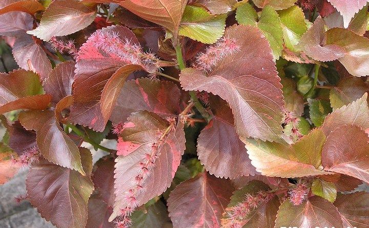 【形态特征】灌木,高1-4米;嫩枝被短毛。叶纸质,阔卵形,古铜绿色或浅红色,常有不规则的红色或紫色斑块,长10-18厘米,宽6-12厘米,顶端渐尖,基部圆钝,边缘具粗圆锯齿,下面沿叶脉具疏毛;基出脉3-5条;叶柄长2-3厘米,具疏毛;托叶狭三角形,长约8毫米,基部宽2-3毫米,具短毛。