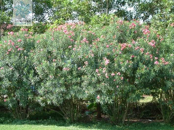 【特征】 常绿直立大灌木,高达5米,枝条灰绿色,含水液;嫩枝条具稜,被微毛,老时毛脱落。叶3-4枚轮生,下枝为对生,窄披针形,顶端急尖,基部楔形,叶缘反卷,长11-15厘米,宽2-2.5厘米,叶面深绿,无毛,叶背浅绿色,有多数洼点,幼时被疏微毛,老时毛渐脱落;中脉在叶面陷入,在叶背凸起,侧脉两面扁平,纤细,密生而平行,每边达120条,直达叶缘;叶柄扁平,基部稍宽,长5-8毫米,幼时被微毛,老时毛脱落;叶柄内具腺体。聚伞花序顶生,着花数朵;总花梗长约3厘米,被微毛;花梗长7-10毫米;苞片披针形,长7毫米,宽1.5毫米;花芳香;花萼5深裂,红色,披针形,长3-4毫米,宽1.5-2毫米,外面无毛,内面基部具腺体;花冠深红色或粉红色,栽培演变有白色或黄色,花冠为单瓣呈5裂时,其花冠为漏斗状,长和直径约3厘米,其花冠筒圆筒形,上部扩大呈钟形,长1.6-2厘米,花冠筒内面被长柔毛,花冠喉部具5片宽鳞片状副花冠,每片其顶端撕裂,并伸出花冠喉部之外,花冠裂片倒卵形,顶端圆形,长1.5厘米,宽1厘米;花冠为重瓣呈15-18枚时,裂片组成三轮,内轮为漏斗状,外面二轮为辐状,分裂至基部或每2-3片基部连合,裂片长2-3.5厘米,宽约1-2厘米,每花冠裂片基部具长圆形而顶端撕裂的鳞片;雄蕊着生在花冠筒中部以上,花丝短,被长柔毛,花药箭头状,内藏,与柱头连生,基部具耳,顶端渐尖,药隔延长呈丝状,被柔毛;无花盘;心皮2,离生,被柔毛,花柱丝状,长7-8毫米,柱头近球圆形,顶端凸尖;每心皮有胚珠多颗。蓇葖2,离生,平行或并连,长圆形,两端较窄,长10-23厘米,直径6-10毫米,绿色,无毛,具细纵条纹;种子长圆形,基部较窄,顶端钝、褐色,种皮被锈色短柔毛,顶端具黄褐色绢质种毛;种毛长约1厘米。花期几乎全年,夏秋为最盛;果期一般在冬春季,栽培很少结果。
