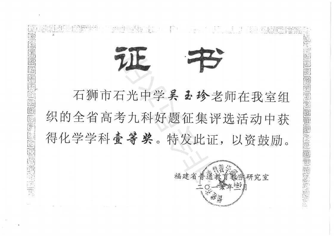 全省高考九科好题征集评选活动中获得化学学科一等奖 吴玉珍 201603