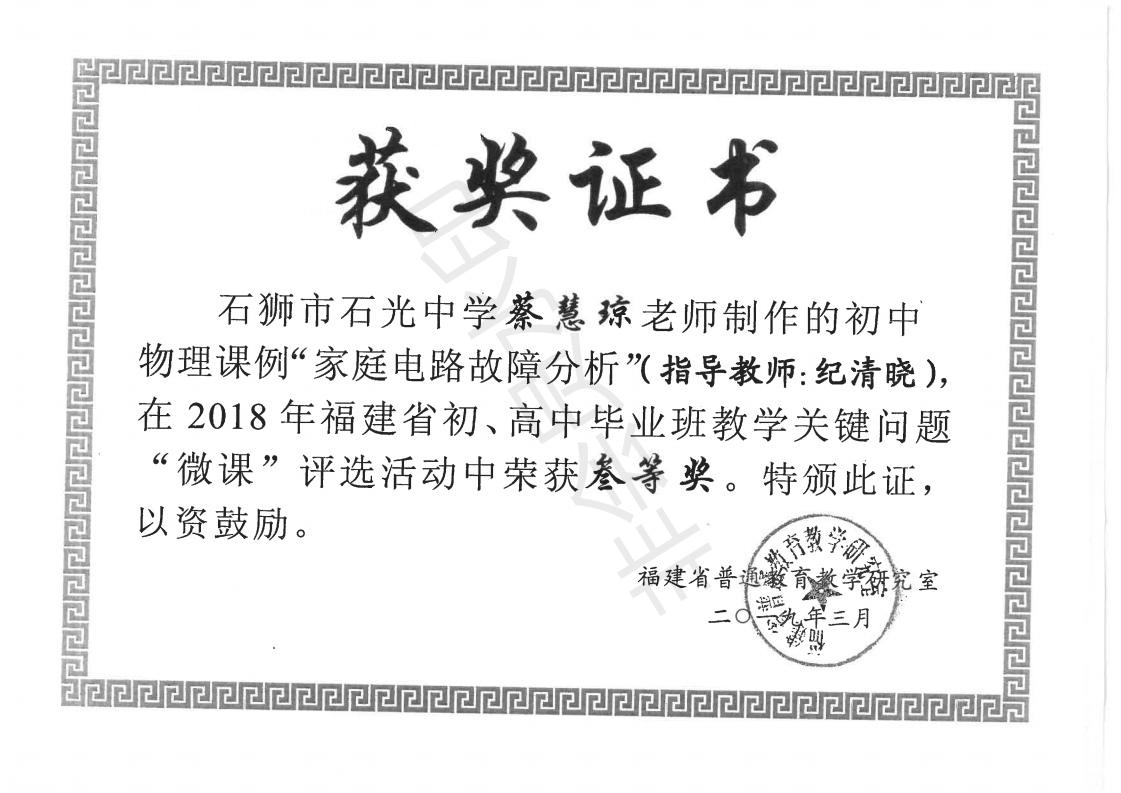 2018年福建省初、高中毕业班教学关键问题“微课”评选活动中荣获叁等奖 蔡慧琼 201903