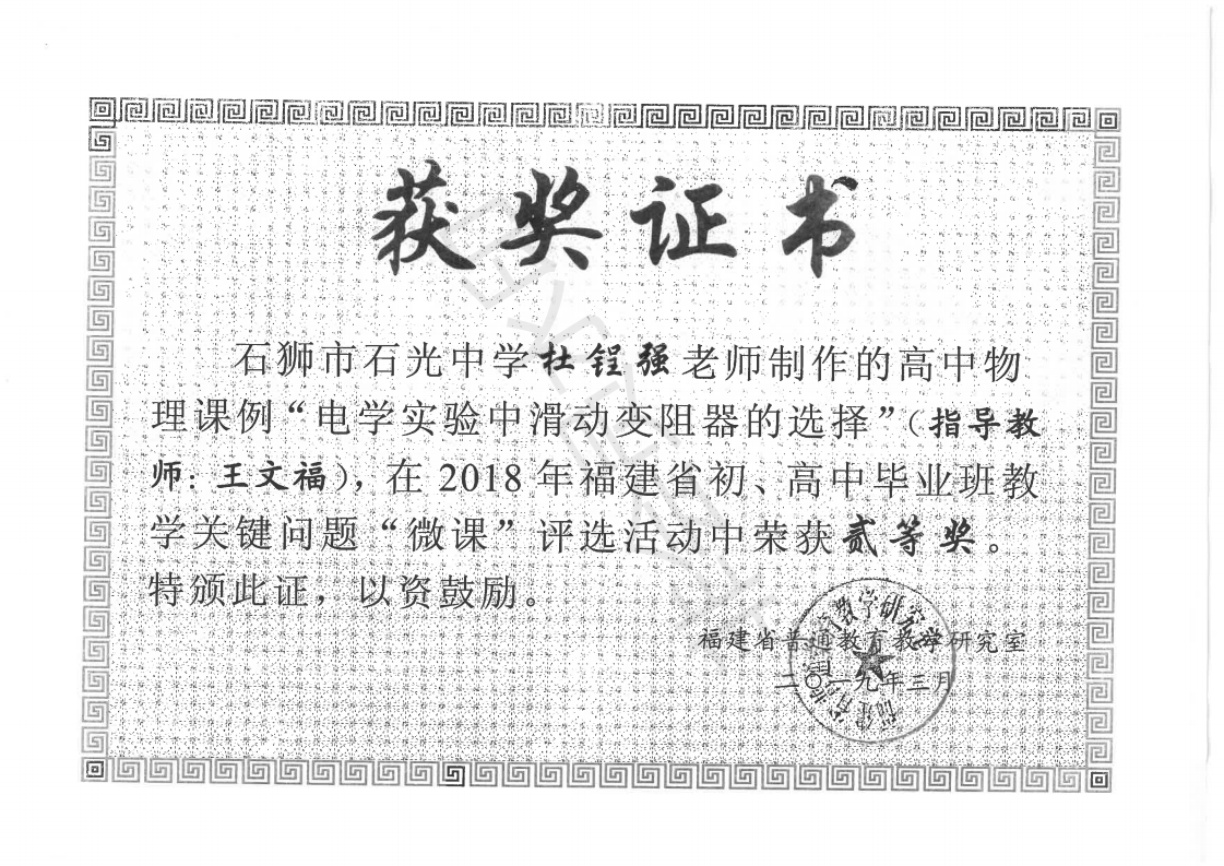 2018年福建省初、高中毕业班教学关键问题“微课”评选活动中荣获贰等奖 杜锃强 201903