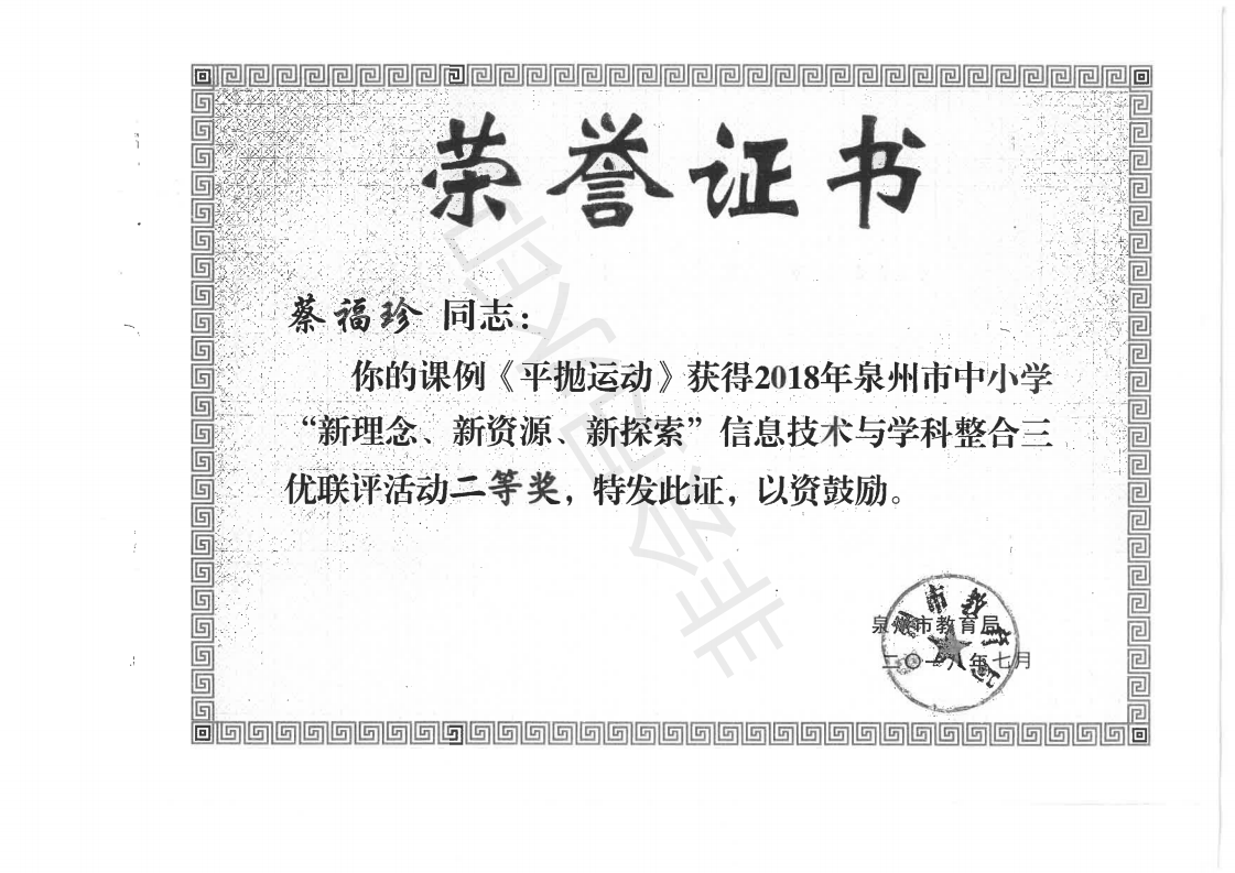 《平抛运动》获得2018年泉州市中小学“新理念、新资源、新探索”信息技术与学科整合三优联评活动二等奖 蔡福珍 201807