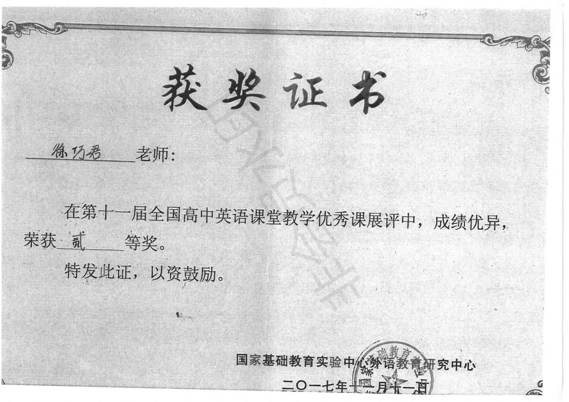 第十一届全国高中英语课堂教学优秀课展评获贰等奖 徐巧君 201711