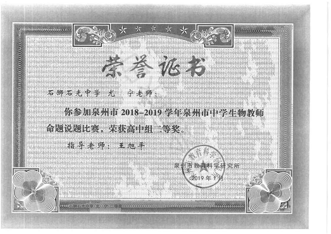 2018-2019学年泉州市中学生物教师命题说题比赛荣获二等奖 尤宁 201901