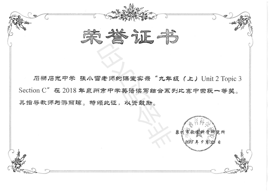 2018年泉州市初、高中毕业班教学关键问题“微课”评选活动中获奖 ( 林蔓、杜锃强、韦晓琳、洪勇辉等多位教师)