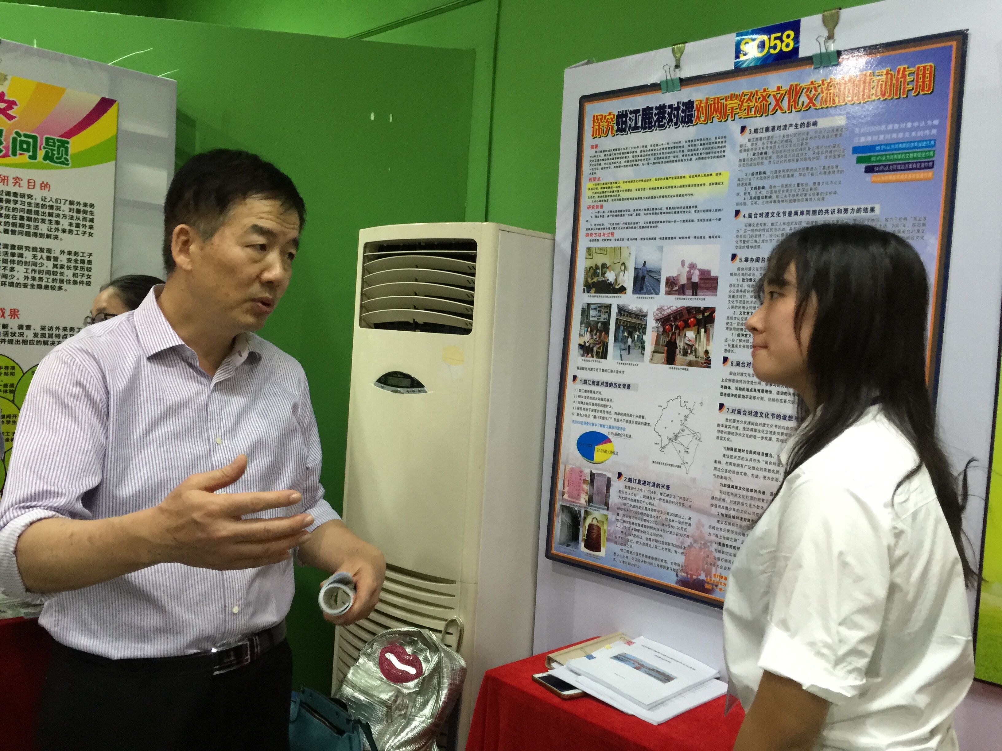 经过初评、现场展示、封闭问辩、评委终评等环节,我校高三年14班黄若馨同学所作,吴莉妹、蔡美玲两位老师指导的“探究蚶江鹿港对渡对两岸经济文化交流的推进作用” 社会科学课题,作为石狮唯一入围大赛复赛的社科项目,在比赛中脱颖而出,荣获科技创新项目社科组一等奖和“泉州市青少年贤銮科技奖”,同时取得第32届福建省青少年科技创新大赛参赛资格。该课题得到福建师范大学、华侨大学、闽南师范大学、泉州师院等高校多名专家、教授的重视和好评。泉州市政协副主席、泉州市科协主席、台盟泉州市委主委骆沙鸣和泉州市教育局副局长蔡琦瑜等主办单位领导在现场展示环节,专门对该课题进行指导,并给予高度肯定。石狮市教育局陈晓东副局长、石狮市教师进修学校黄建功主任到赛场看望和指导我校参赛学生。