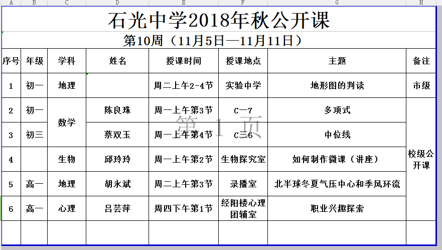 石光中学2018年秋公开课安排表(第10周)