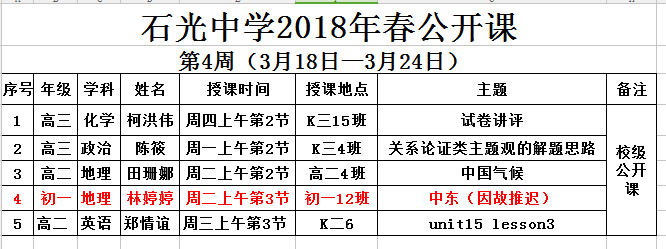石光中学2018年春公开课安排表(第4周)