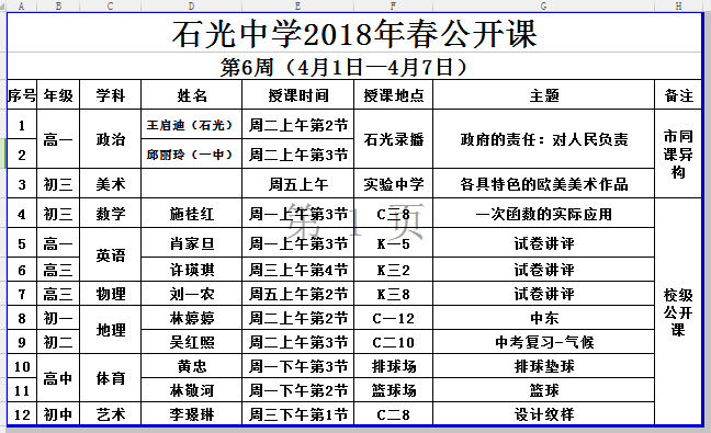 石光中学2018年春公开课安排表(第6周)