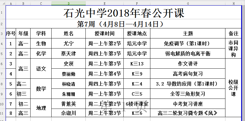 石光中学2018年春公开课安排表(第7周)
