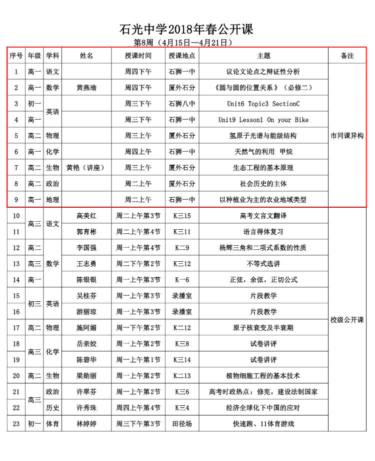 石光中学2018年春公开课安排表(第9周泉州市教学开放周)