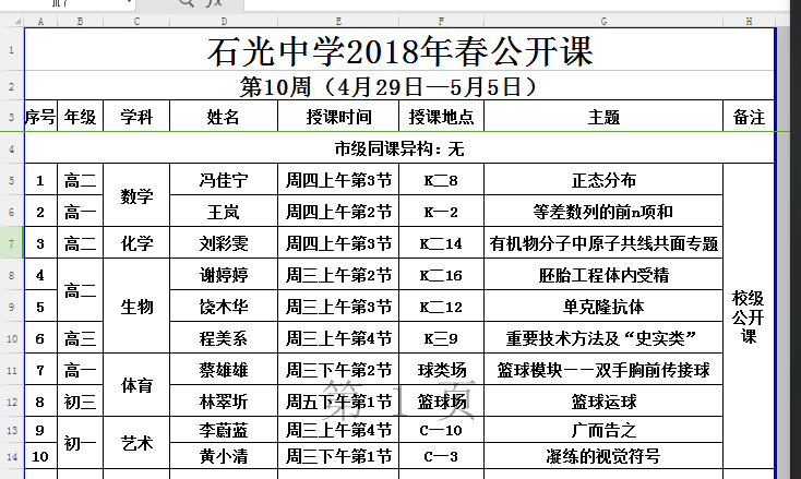 石光中学2018年春公开课安排表(第10周)