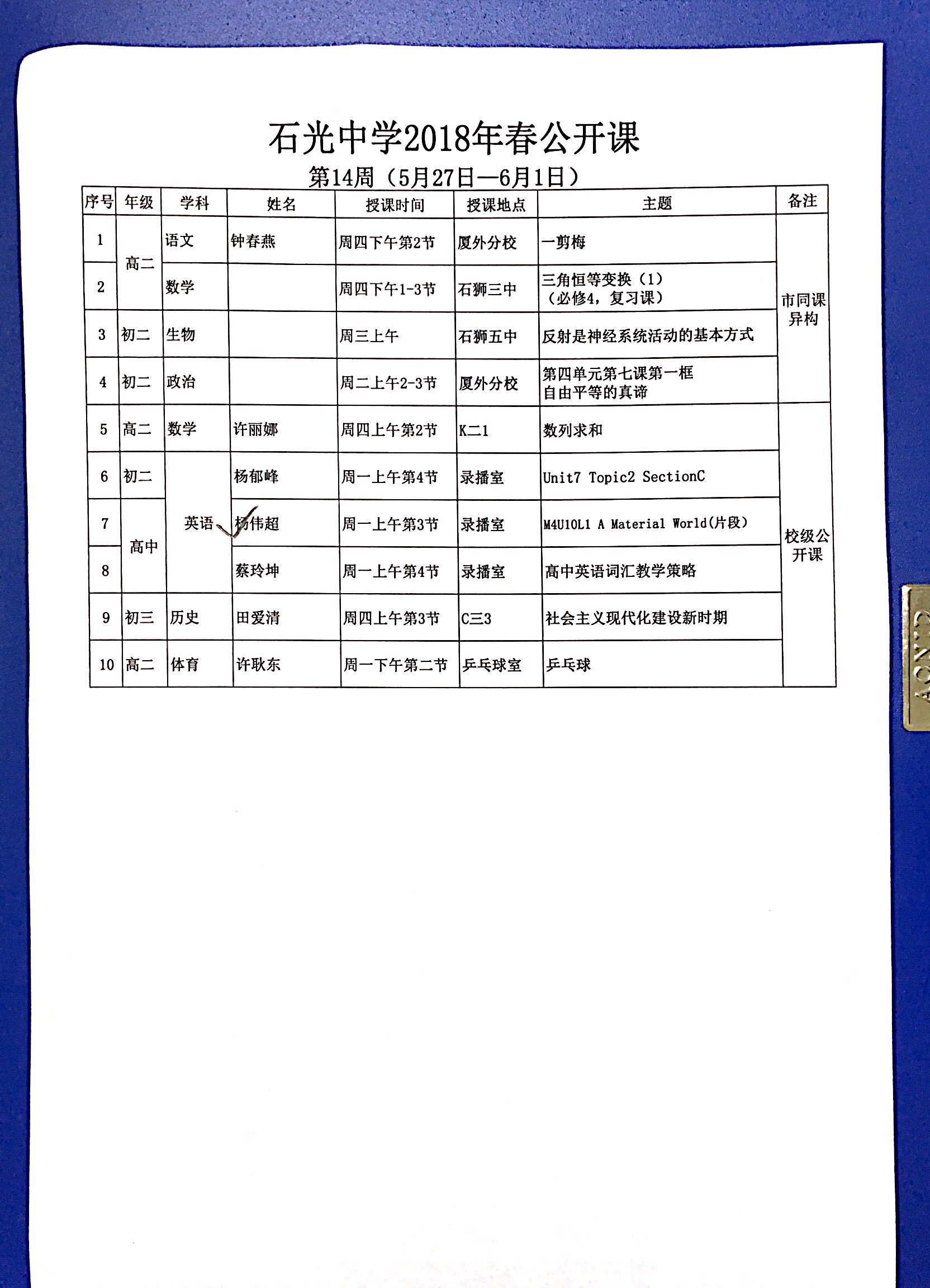石光中学2018年春公开课安排表(第14周)