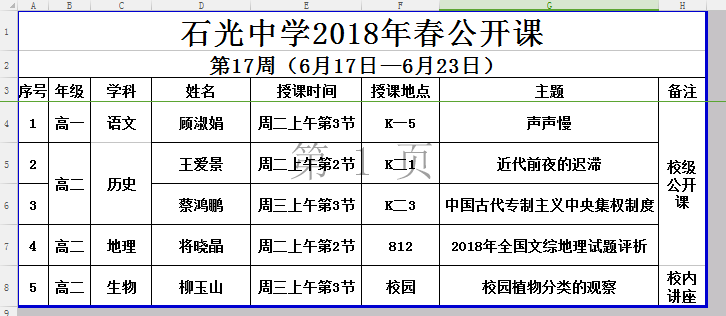 石光中学2018年春公开课安排表(第17周)