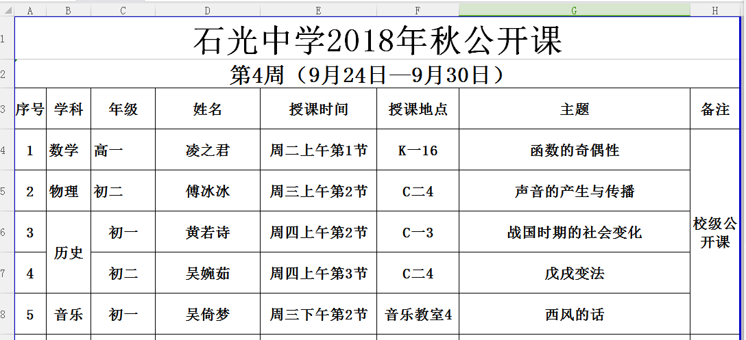 石光中学2018年秋公开课安排表(第4周)