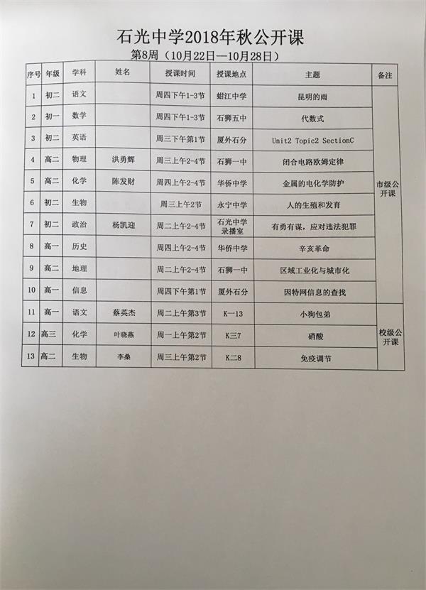 石光中学2018年秋公开课安排表(第8周)