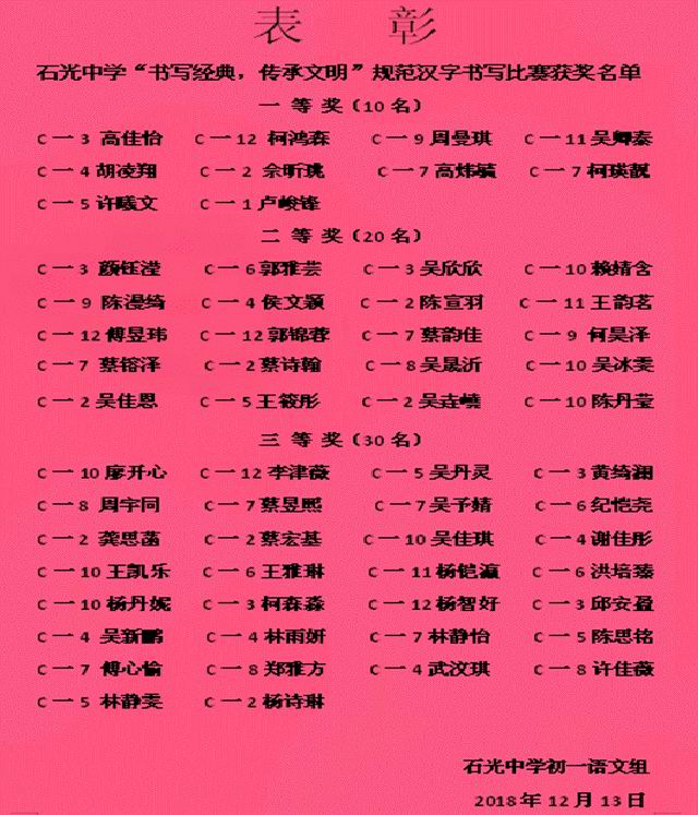 挥毫写经典 墨香满校园——石光中学初一年段规范汉字书写比赛