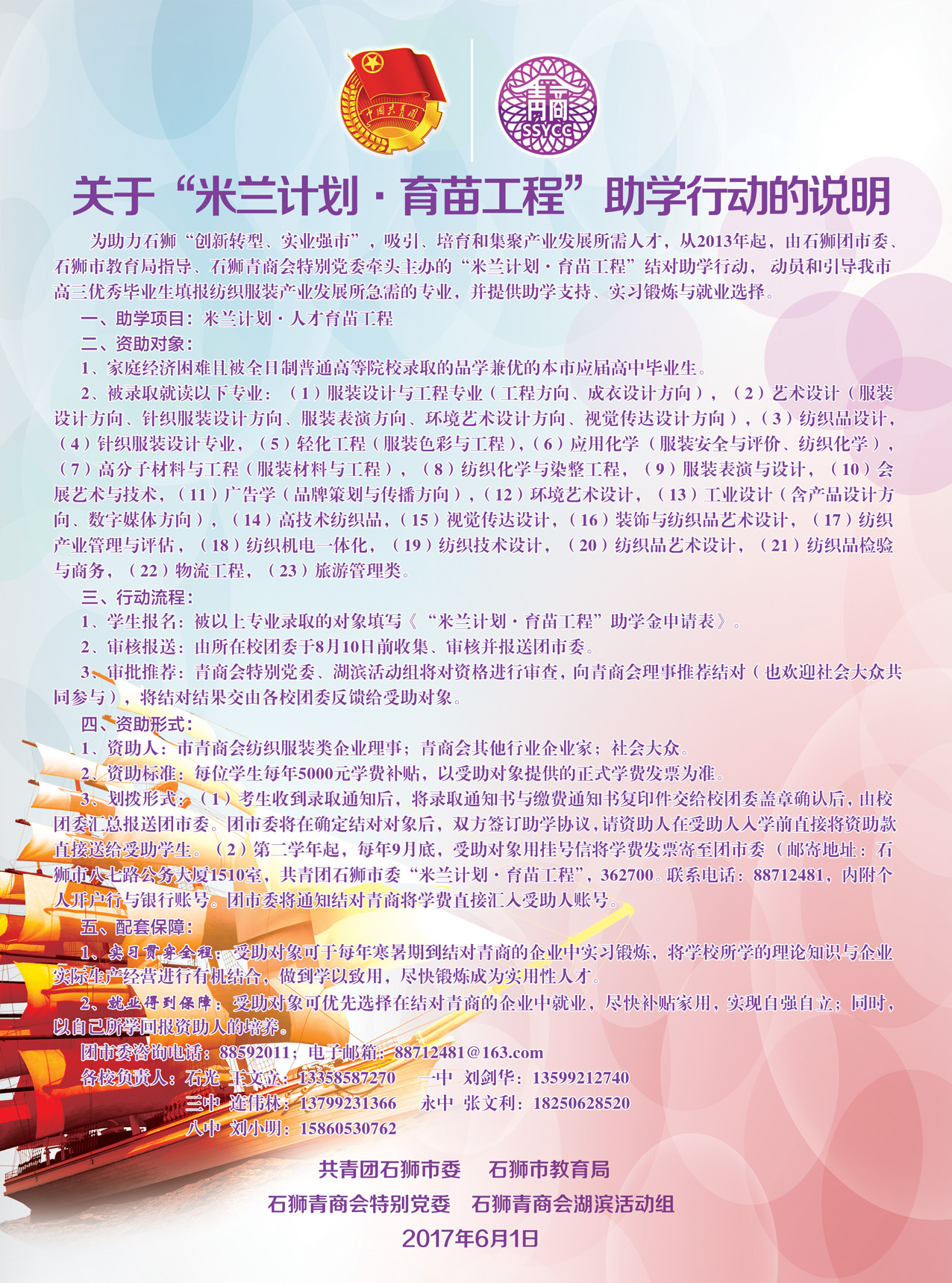 为助力石狮“创新转型、实业强市”,吸引、培育和集聚产业发展所需人才,从2013年起,由石狮团市委、石狮市教育局指导、石狮青商会特别党委牵头主办的“米兰计划·育苗工程”结对助学行动, 动员和引导我市高三优秀毕业生填报纺织服装产业发展所急需的专业,并提供助学支持、实习锻炼与就业选择。