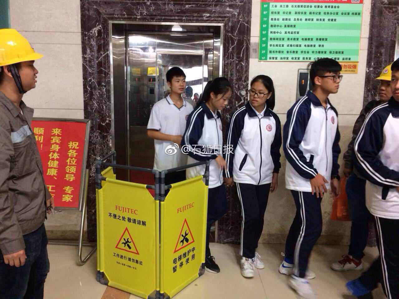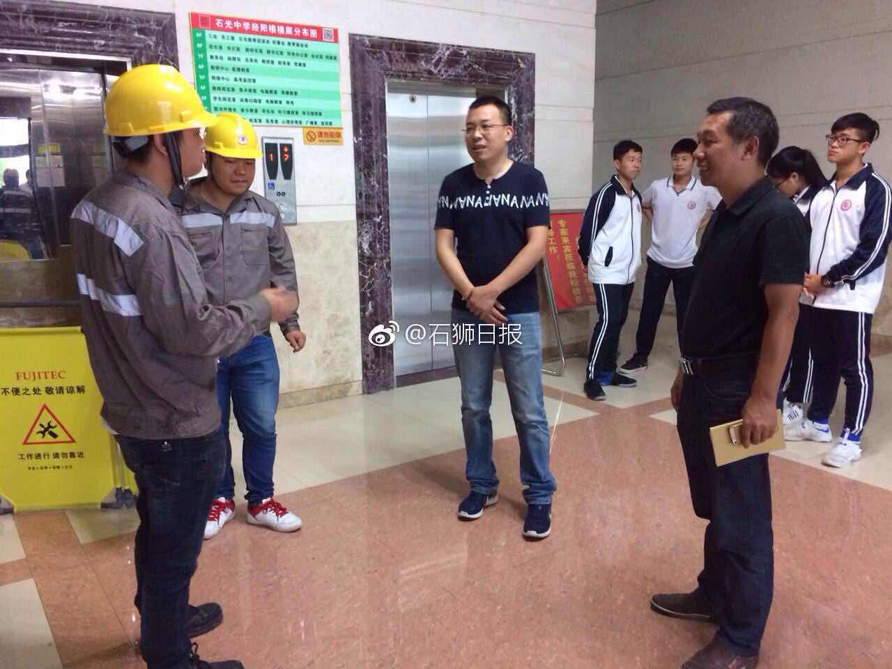 为开展好2017年“安全生产月”系列宣传活动,6月16日,石光中学联合市市场监督管理局和我校电梯维保单位,在我校办公楼开展电梯应急救援演练活动,以加强电梯安全知识宣传和突发事故的应急救援工作,提高电梯突发事故应急处理救援水平,多名师生参与了演练。