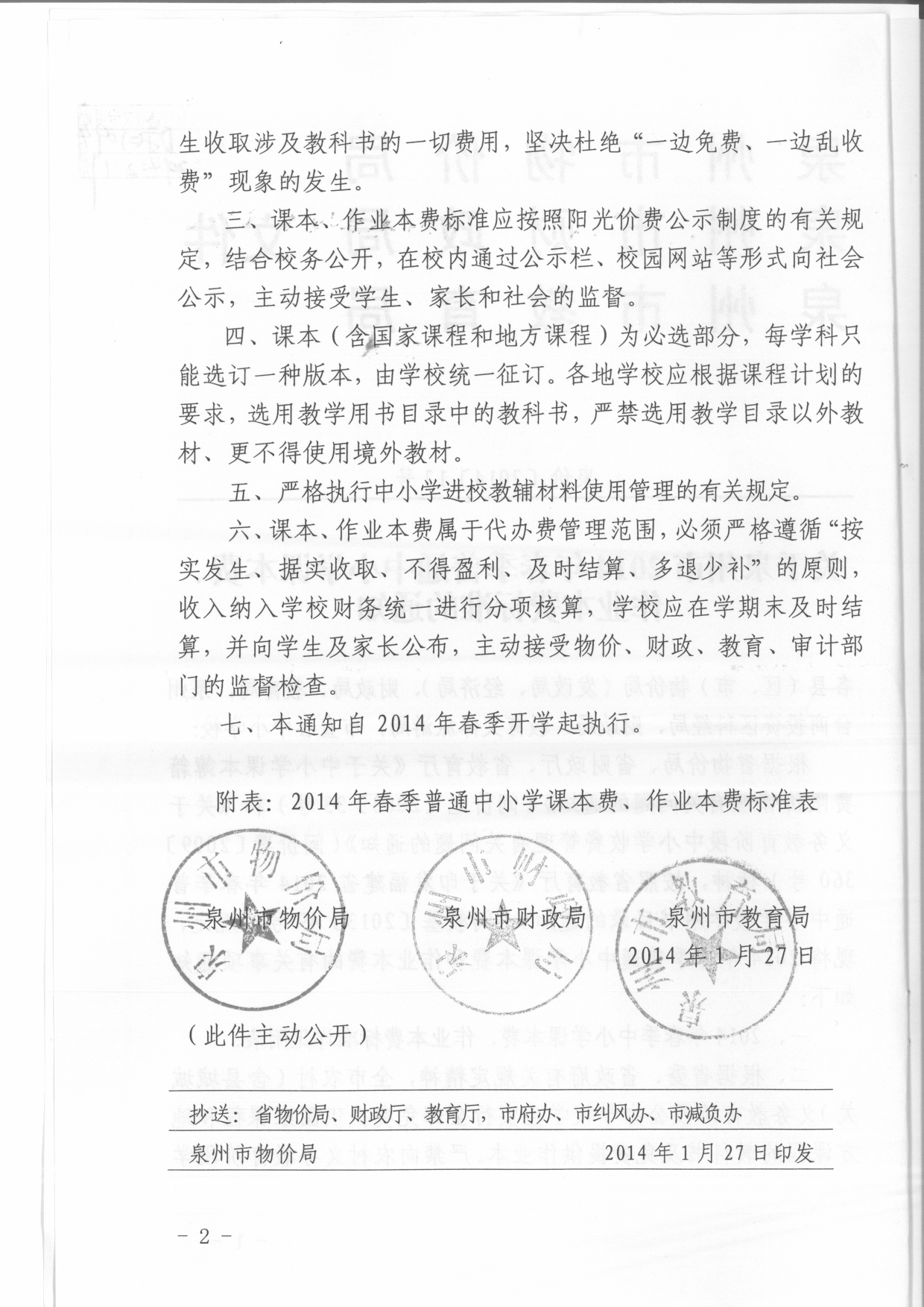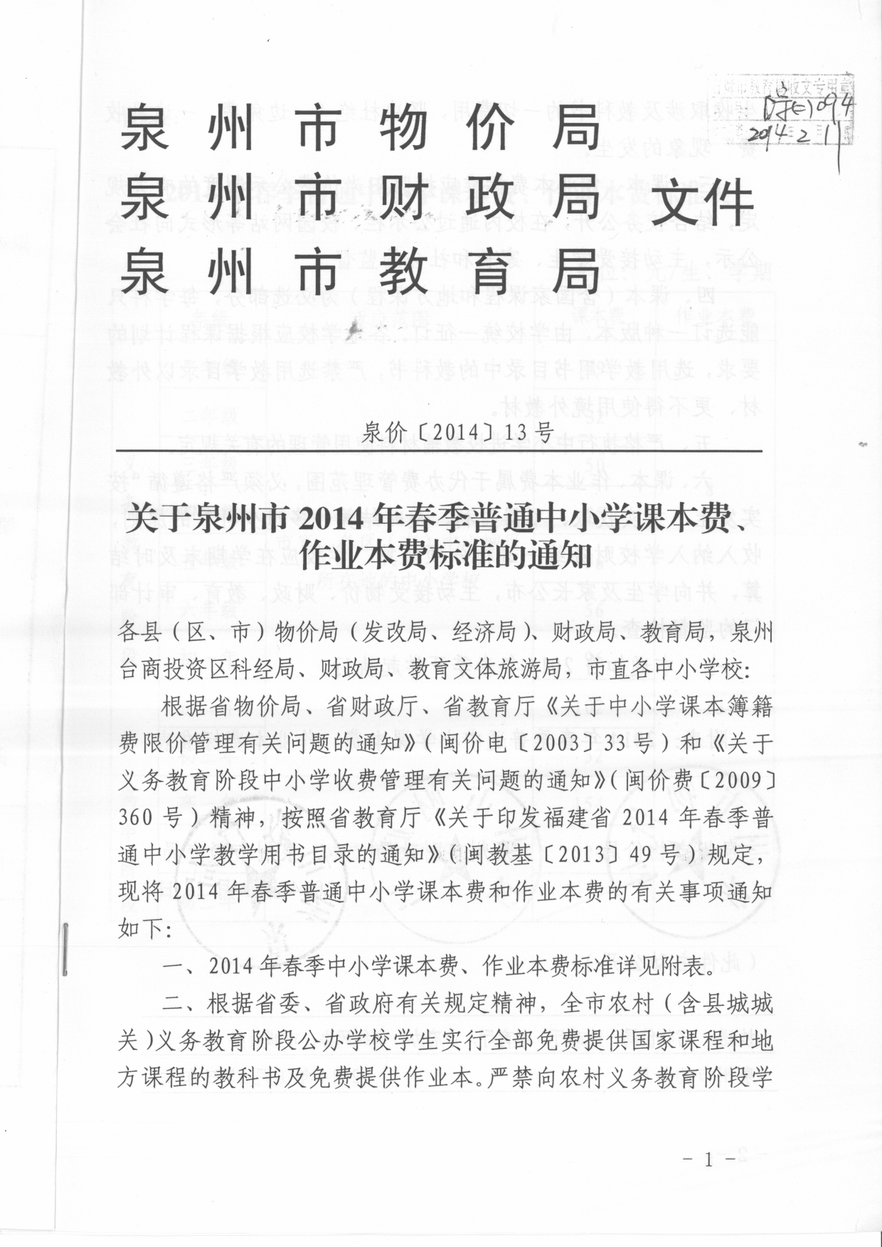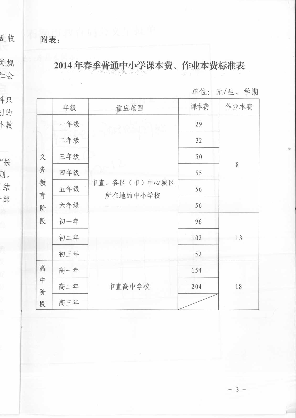 2014年春季石狮市公办中小学、幼儿园、中职学校、素质教育实践基地收费一览表