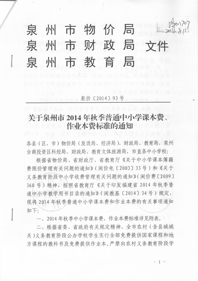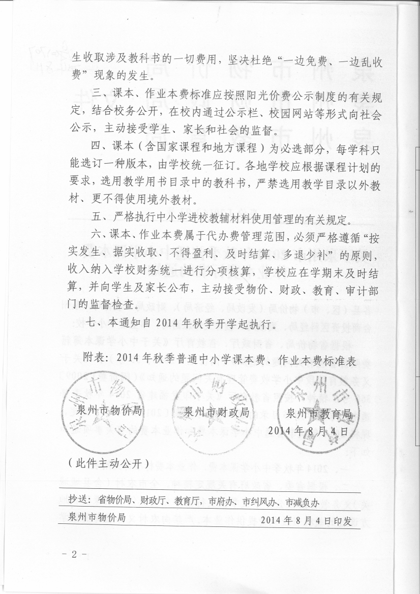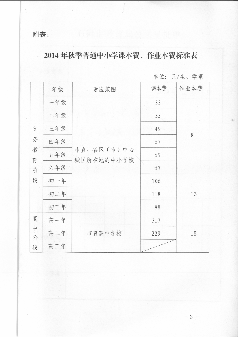 2014年秋季石狮市公办中小学、幼儿园、中职学校、素质教育实践基地收费一览表