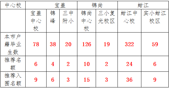 面向上述区域小学推荐的优秀毕业生,招收1个初中联办班。按各镇中心校本市户籍小学毕业生数的按比例分配推荐名额。按招收人数1:1.5确定推荐入围人选。具体推荐名额分配如下: