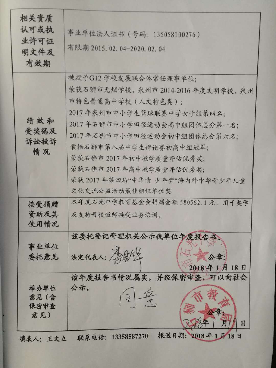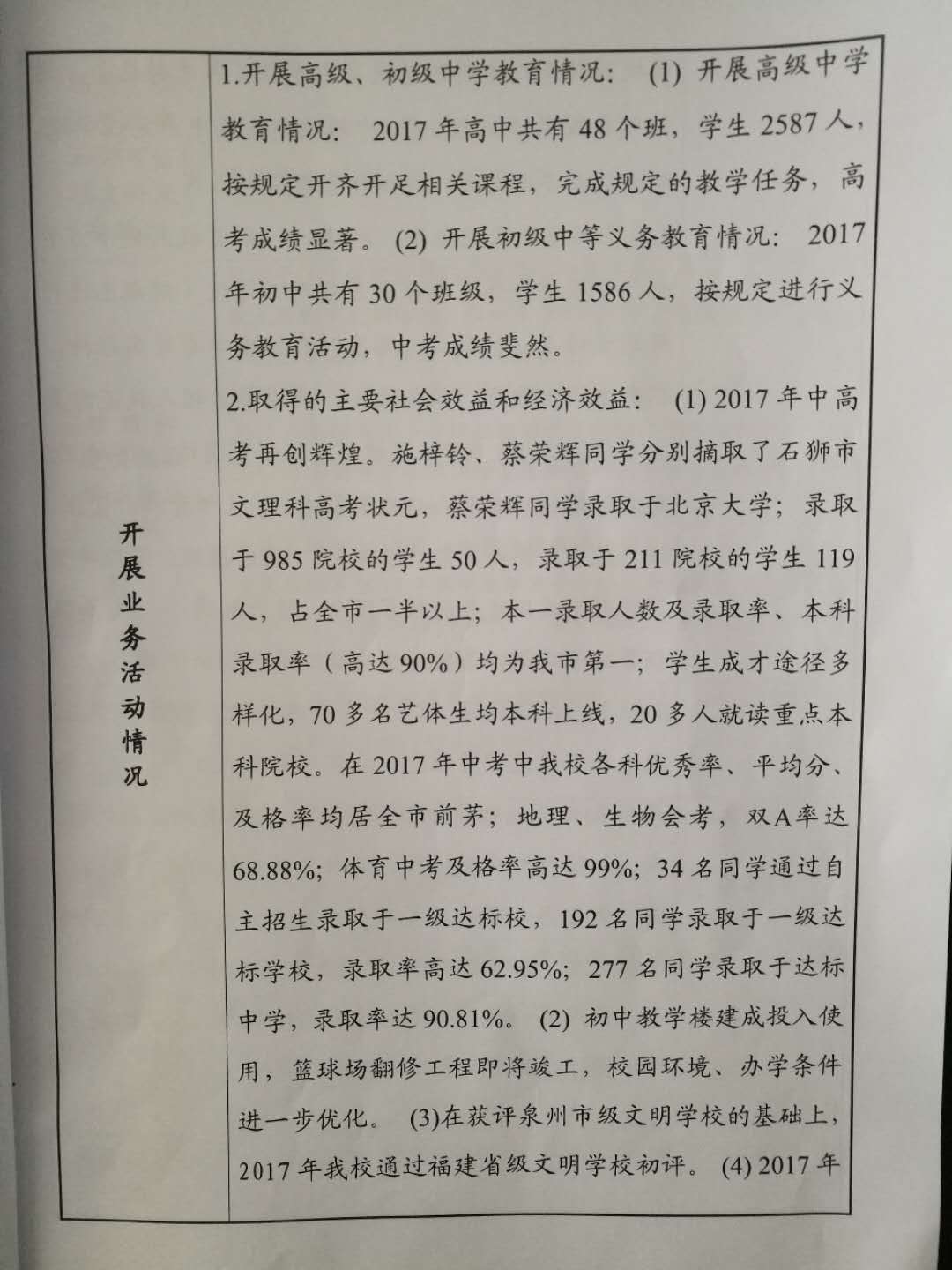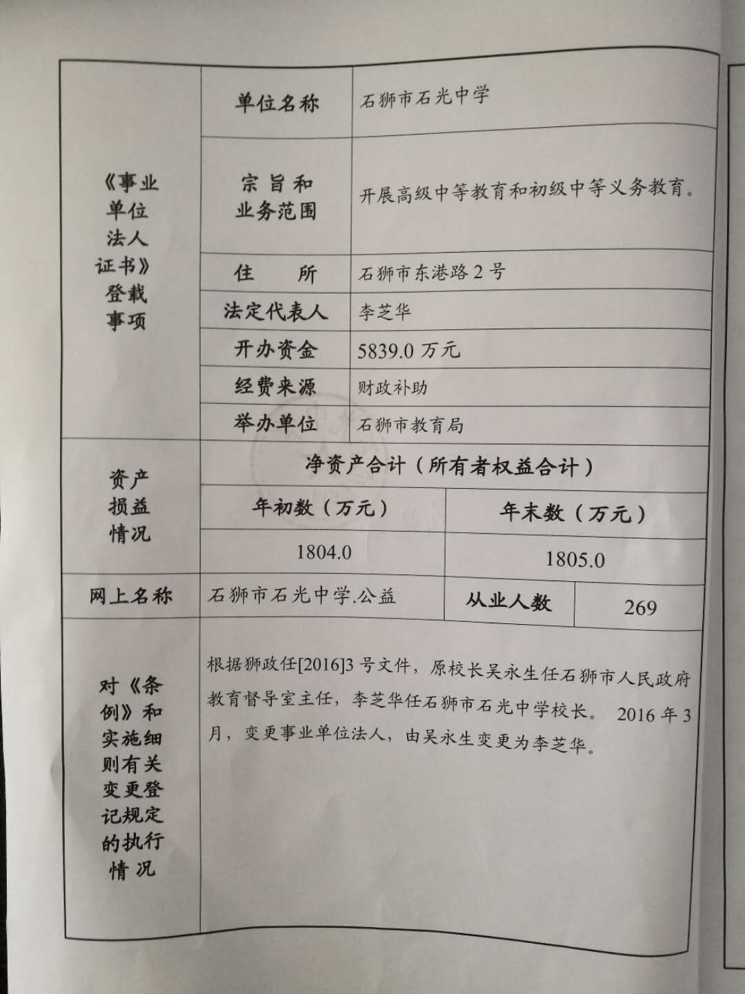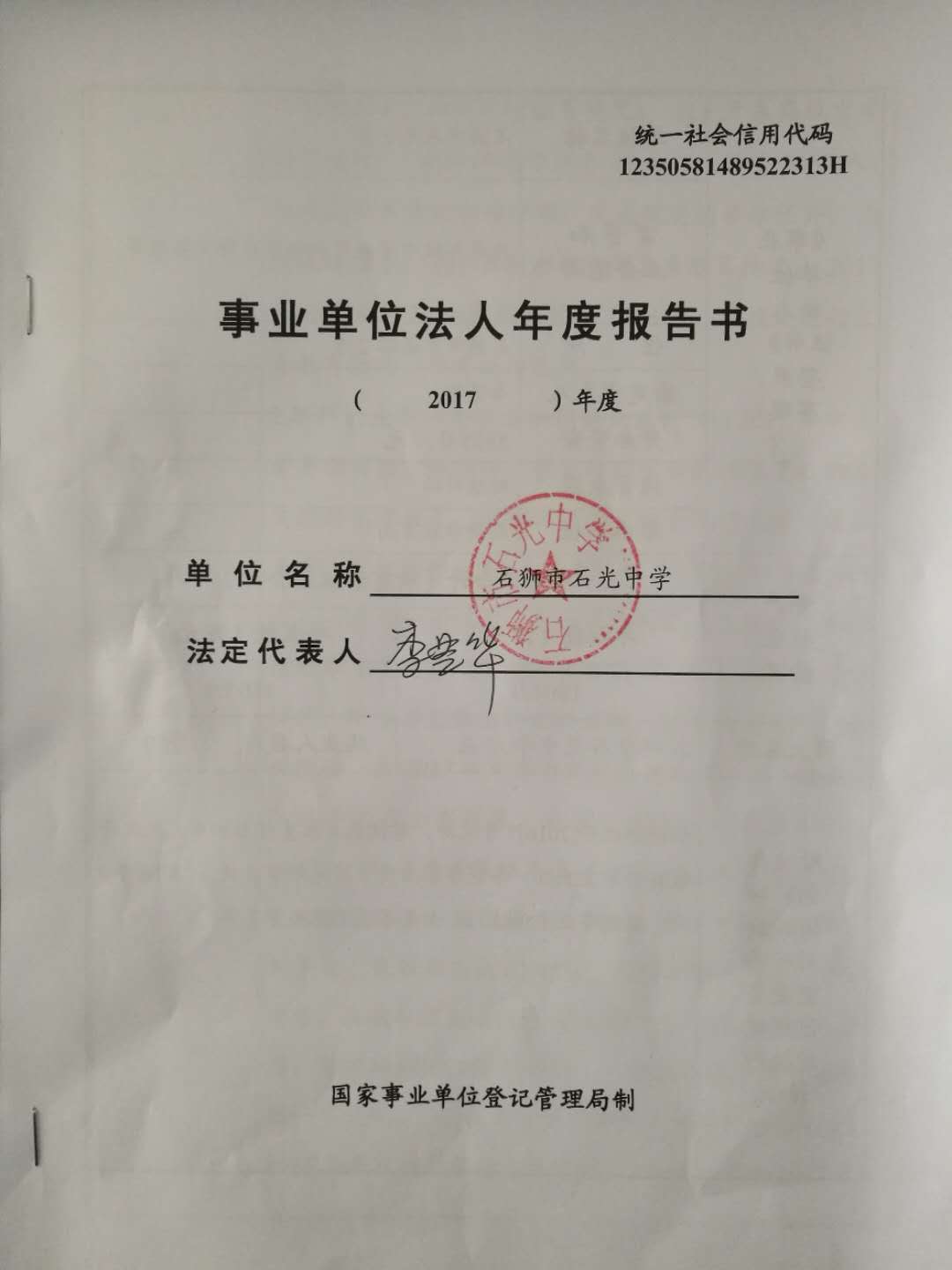 石光中学2017年度事业单位法人年度报告公示