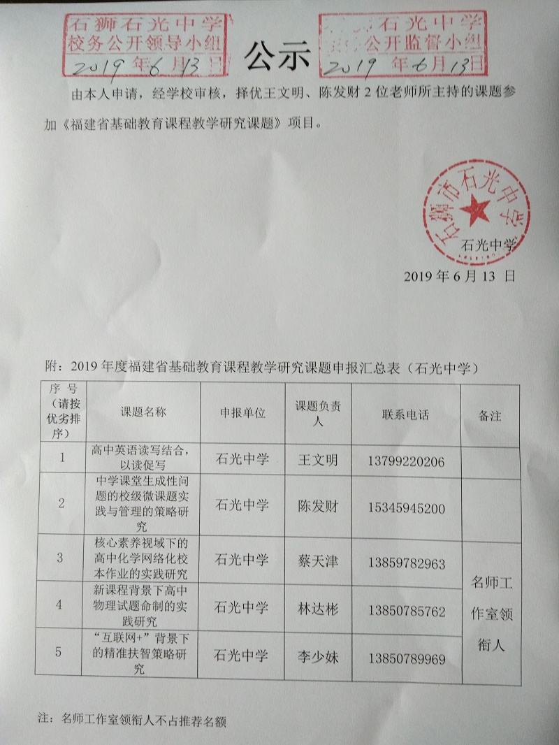 关于公布石狮市推荐2019年度泉州市、 福建省基础教育课程教学研究课题评选结果的通知