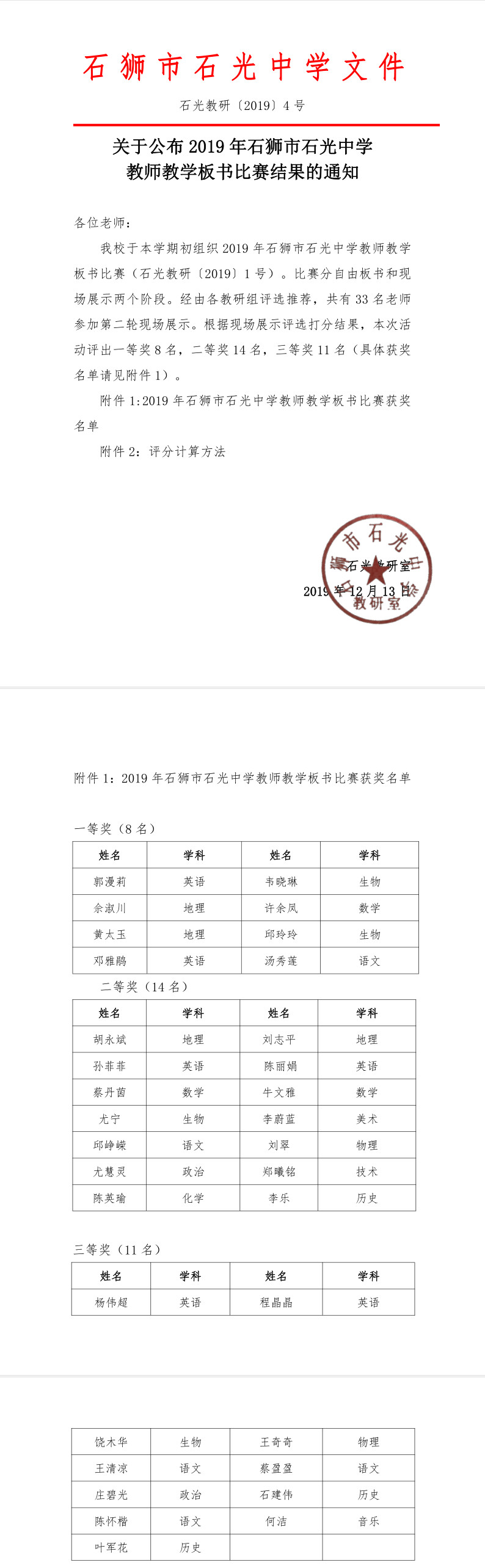 关于公布2019年石狮市石光中学教师教学板书比赛结果的通知