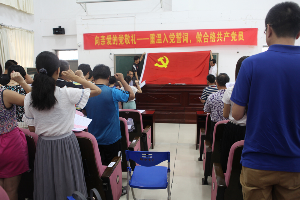 2016年6月,石光中学党总支在学校阶梯会议室举行了 “向亲爱的党敬礼——重温入党誓词,做合格共产党员”活动。119名党员在掷地有声的宣誓中重温了入党誓词,拉开了学校开展主题为“铸党魂,做合格党员;创业绩,做合格教师;迎校庆,促学校发展”纪念建党95周年“十个一”系列教育活动序幕。“十个一”活动内容有:1、开展一次走访慰问老党员、贫困党员活动;2、发出一封“致全校共产党员的倡议书”;3、组织一场纪念建党95周年表彰会和《深入开展’两学一做’学习教育,推动学校各项工作开展》党课讲座暨“承传石光精神,铸造高尚师德”“校园十大师德之星”报告大会;4、举行一次“向亲爱的党敬礼——重温入党誓词,做合格共产党员”活动;5、开展一次优秀教师和优秀共产党员事迹宣传活动;6、举行一次师生主题征文活动;7、举行一次义务劳动“党员奉献日”活动;8、开展一次全校师生员工“铸党魂,做合格党员;创业绩,做优秀教师;迎校庆,促学校发展”主题教育书法、绘画、摄影、创意优秀作品展活动;9、开展一次全体党员“两学一做”主题教育知识测试竞赛活动;10、举行一次全校性纪念建党95周年“国旗下讲话”活动。
