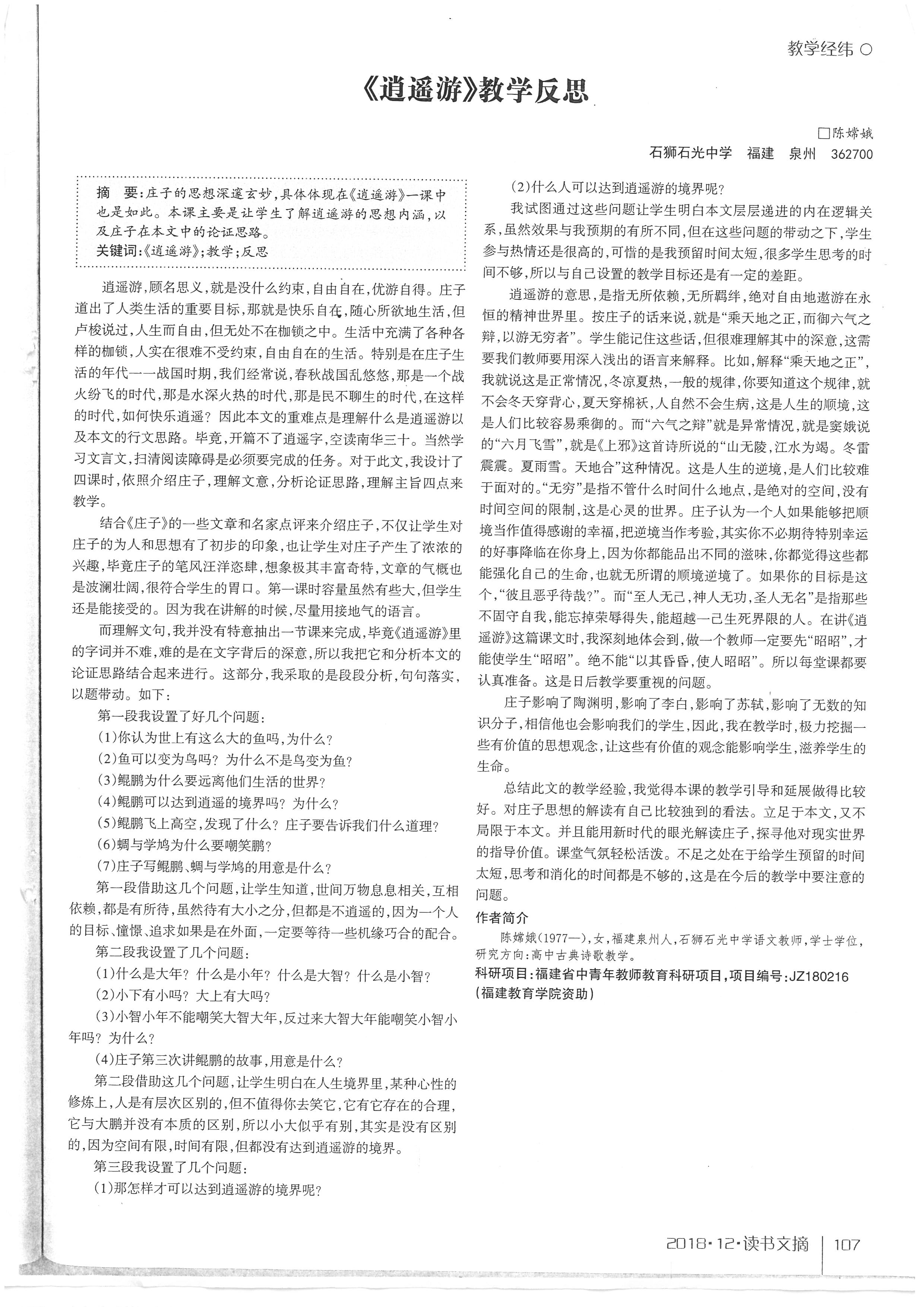 《逍遥游》教学反思 陈嫦娥 201812