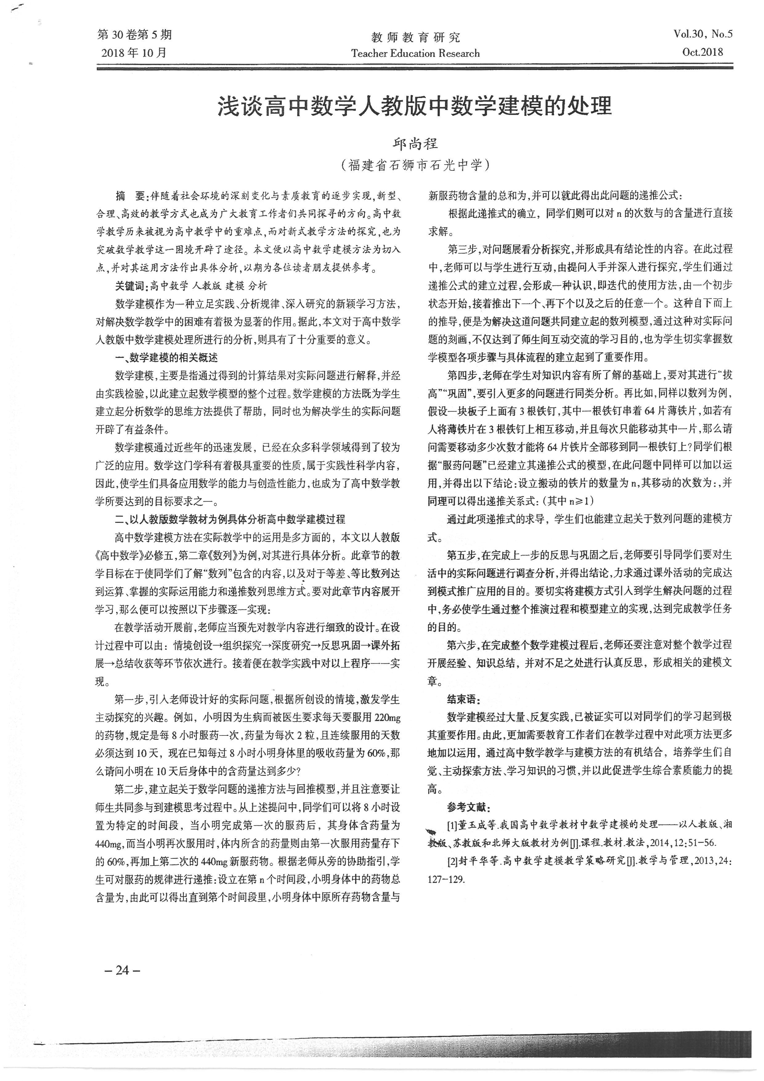 浅谈高中数学人教版中数学建模的处理 邱尚程 201810