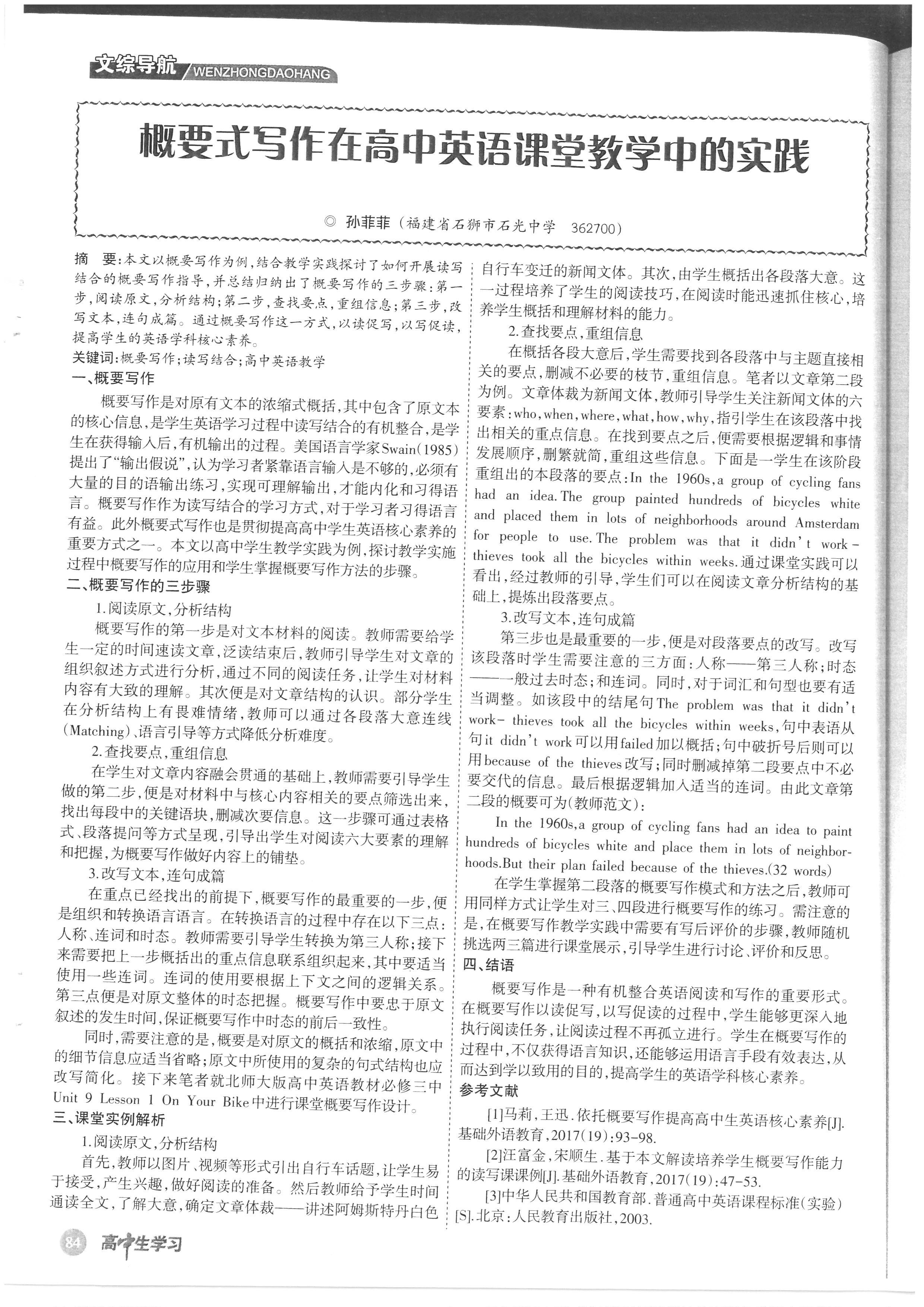 概要式写作在高中英语课堂教学中的实践 孙菲菲 201812