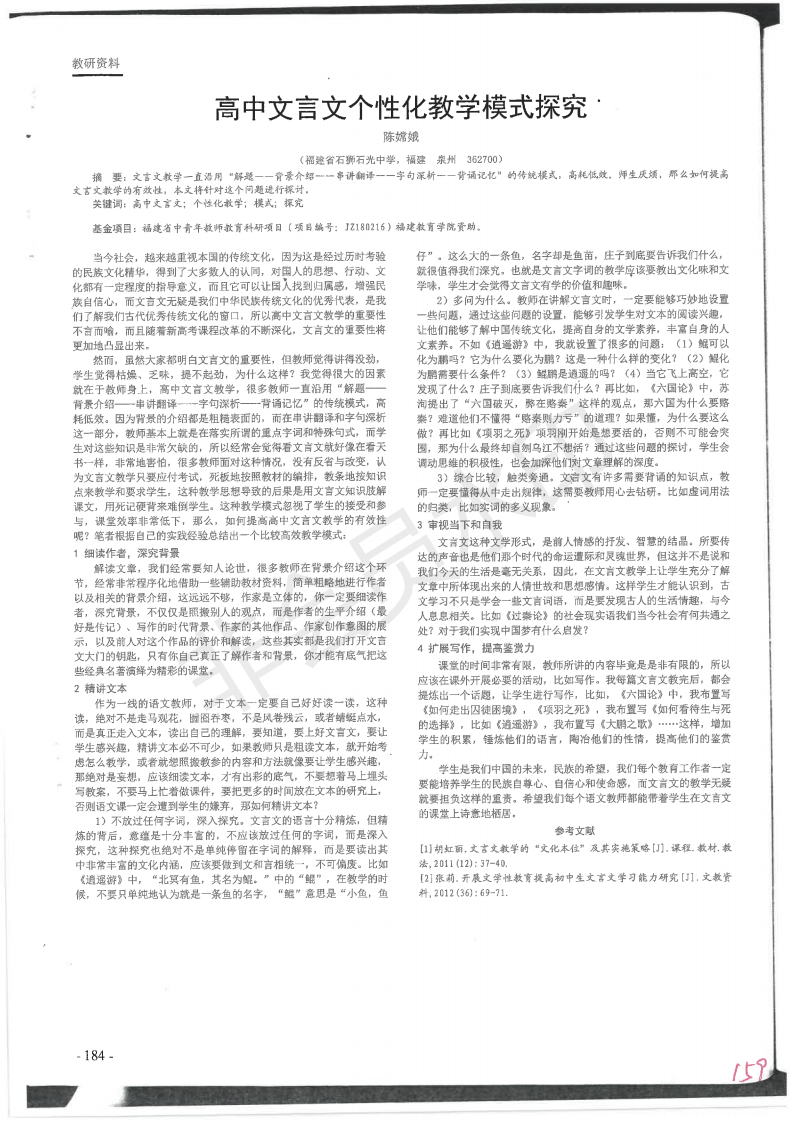 高中文言文个性化教学模式探究 陈嫦娥 201901