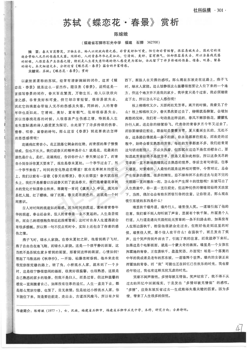 苏轼《蝶恋户·春景》赏析 陈嫦娥 201902