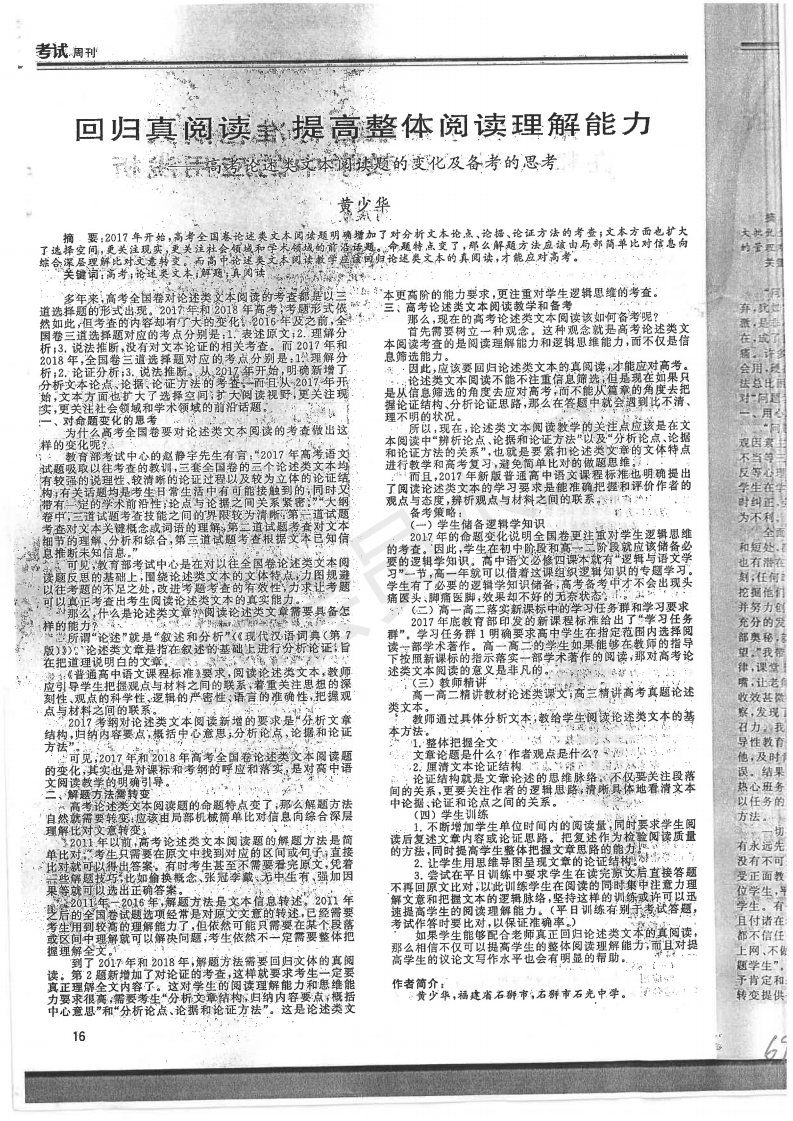 回归真阅读 提高整体阅读理解能力——高考论述类文本阅读题的变化及备考的思考 黄少华 201902