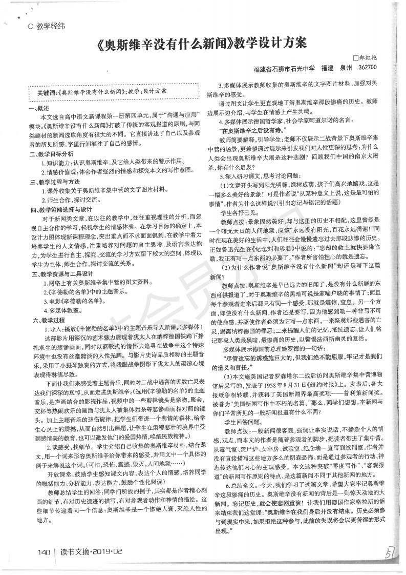 《奥斯维辛没有什么新闻》教学设计方案 郑红艳 201902