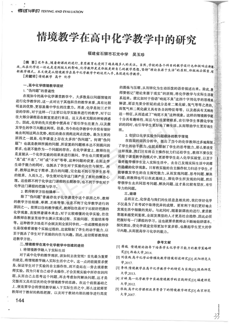 情境教学在高中化学教学中的研究 吴玉珍 201902