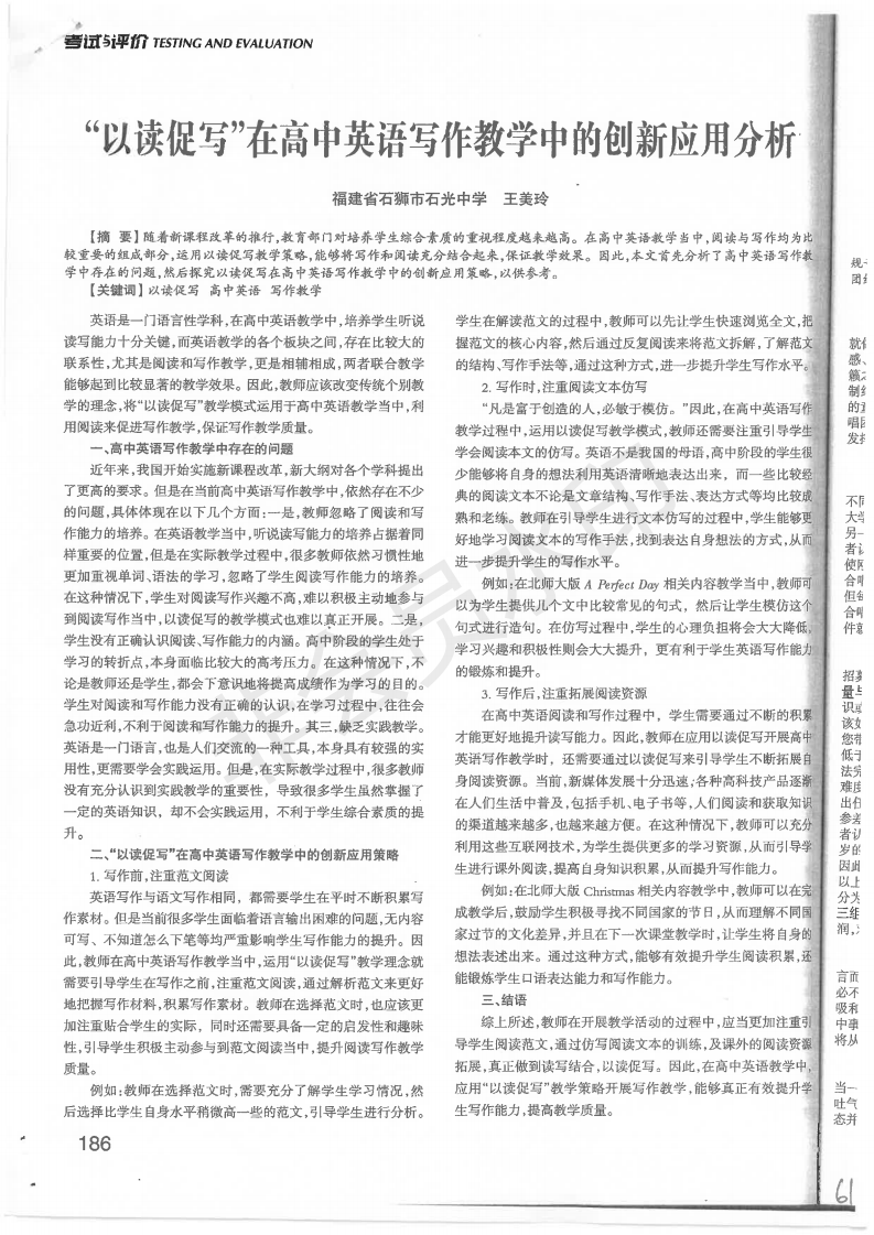 “以读促写”在高中英语写作教学中的创新应用分析 王美玲 201902