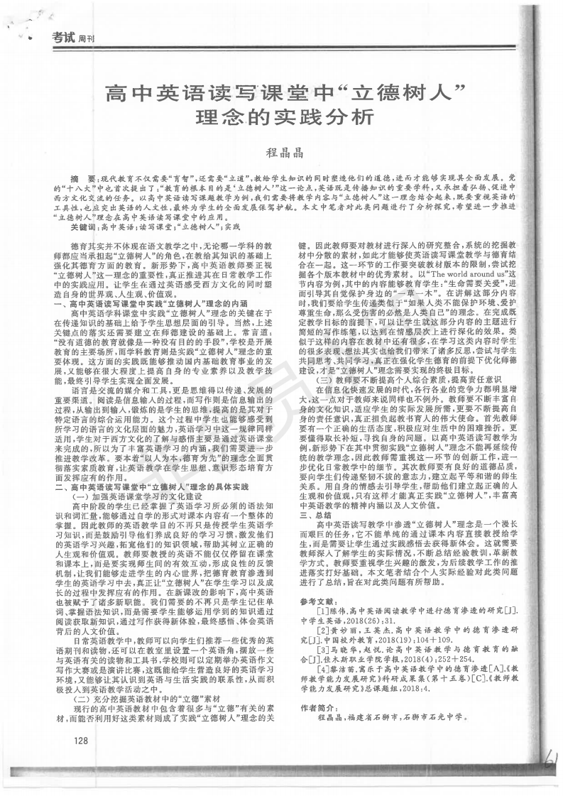 高中英语读写课堂中“立德树人”理念的实践分析 程晶晶 201903