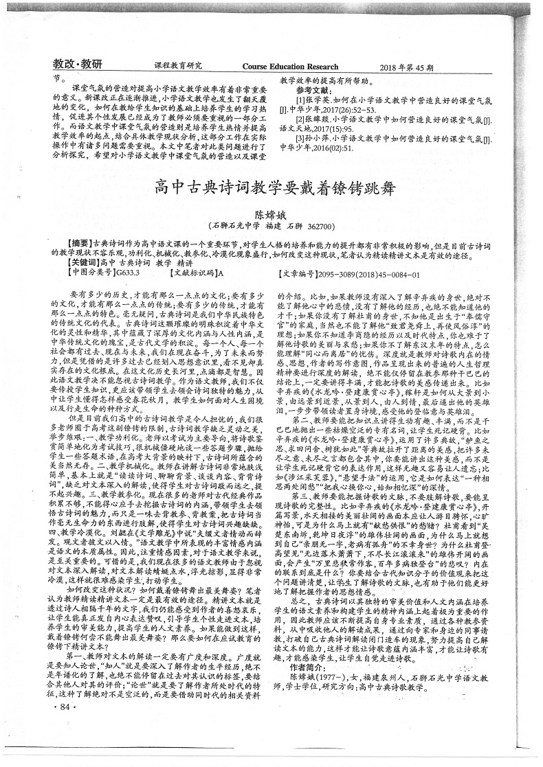高中古典诗词教学要戴着镣铐跳舞 陈嫦娥 201811