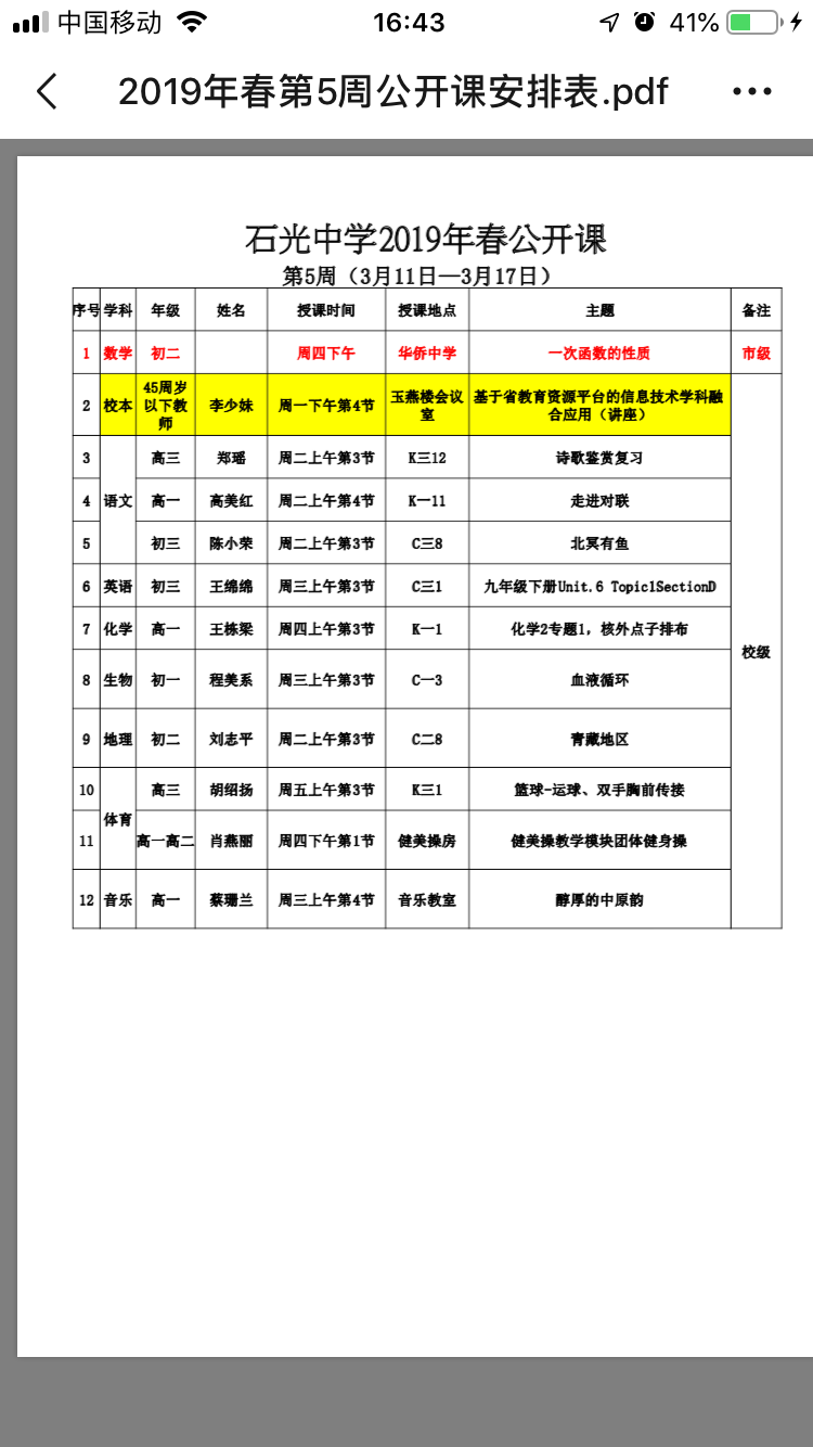 石光中学2019年春公开课安排表(第5周)