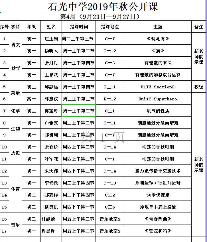石光中学2019年秋公开课安排表(第4周)